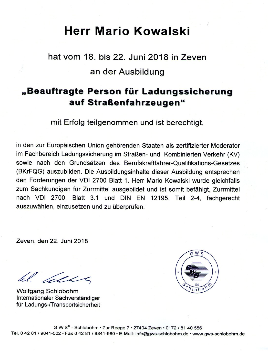 - Ausgestellt/unterzeichnet in Zeven von Wolfgang Schlobohm (Internationaler Sachverständiger für Ladungs-/Transportsicherheit)